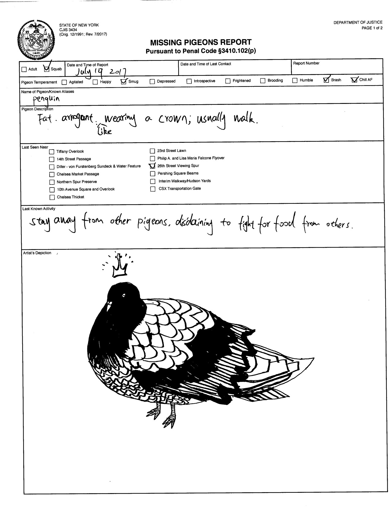 An experiment in an unfolding, cross-media narrative taking place at the High Line; a vast conspiracy of vanishing pigeons I created, using faked government documents or "Missing Pigeons Reports", that I then had random passers-by on the High Line fill out. I acted as the detective in the center of this story, and created gifs, artifacts, and weird outsider-art to flesh out the surrealist narrative. It culminated in an installation at MFA Visual Narrative's semester end showcase, where visitors could fill out more reports and get swag.